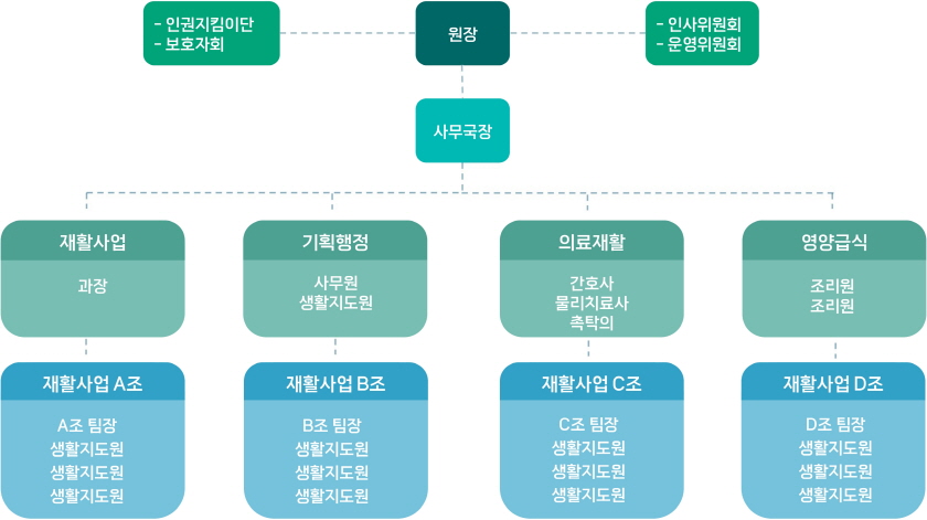문수마을 조직도 시설안내도 1층 조리실 휴게실 기계실 보시방 지계방 화엄방 상담실 식당 2층 지장방 반야방 선정방 지혜방 정진방 인욕방 도서실 & 프로그램실 상담실 3층 옥상 원장실 국장실 사무실 & 프로그램실